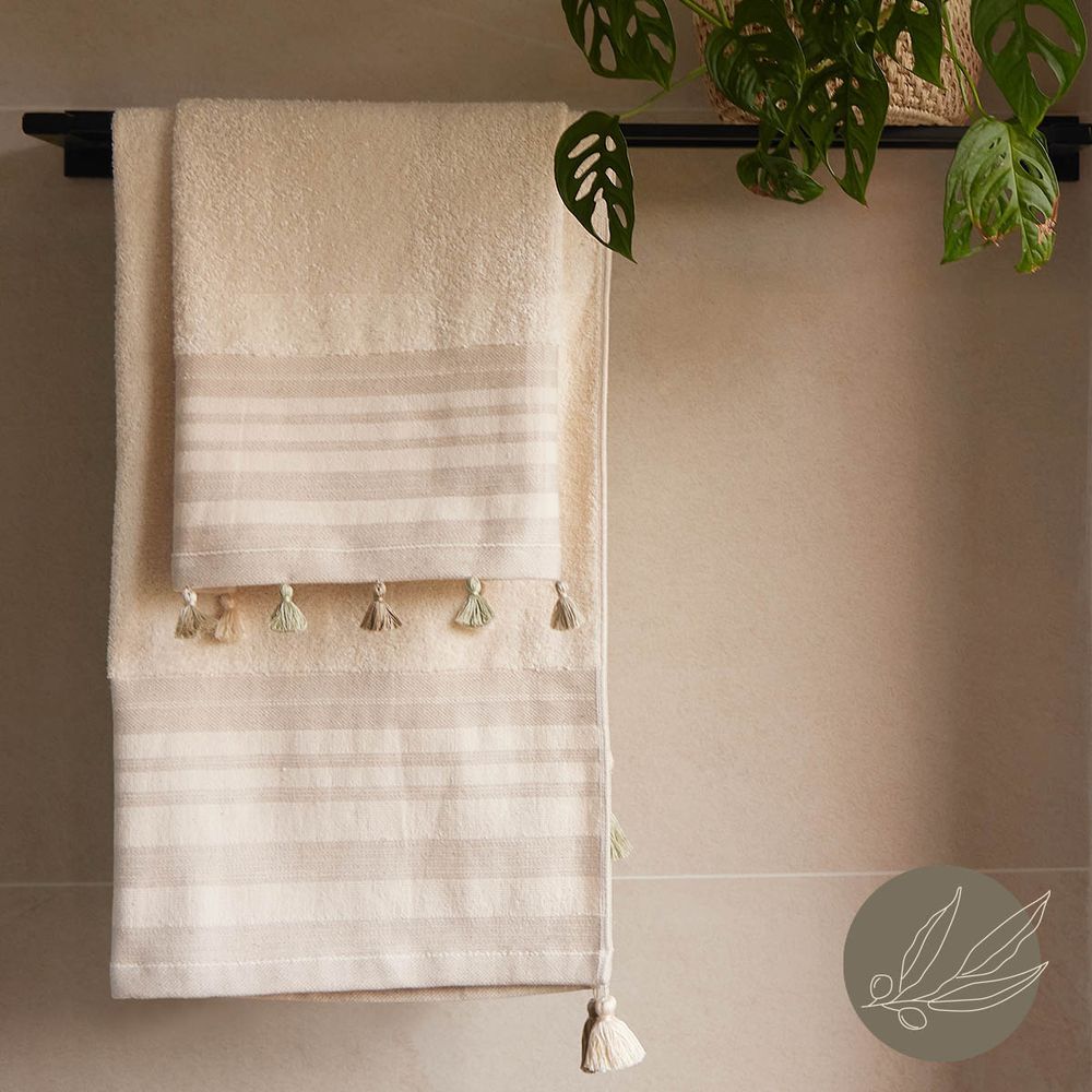 Nuestro Set de toallas de Manos y Cuerpo de 500 grs, 100% Algodón con cenefa con fibras de lino, decorado con delicadas borlas hechas a mano, añade una estética artesanal y celebra la dedicación de manos expertas.